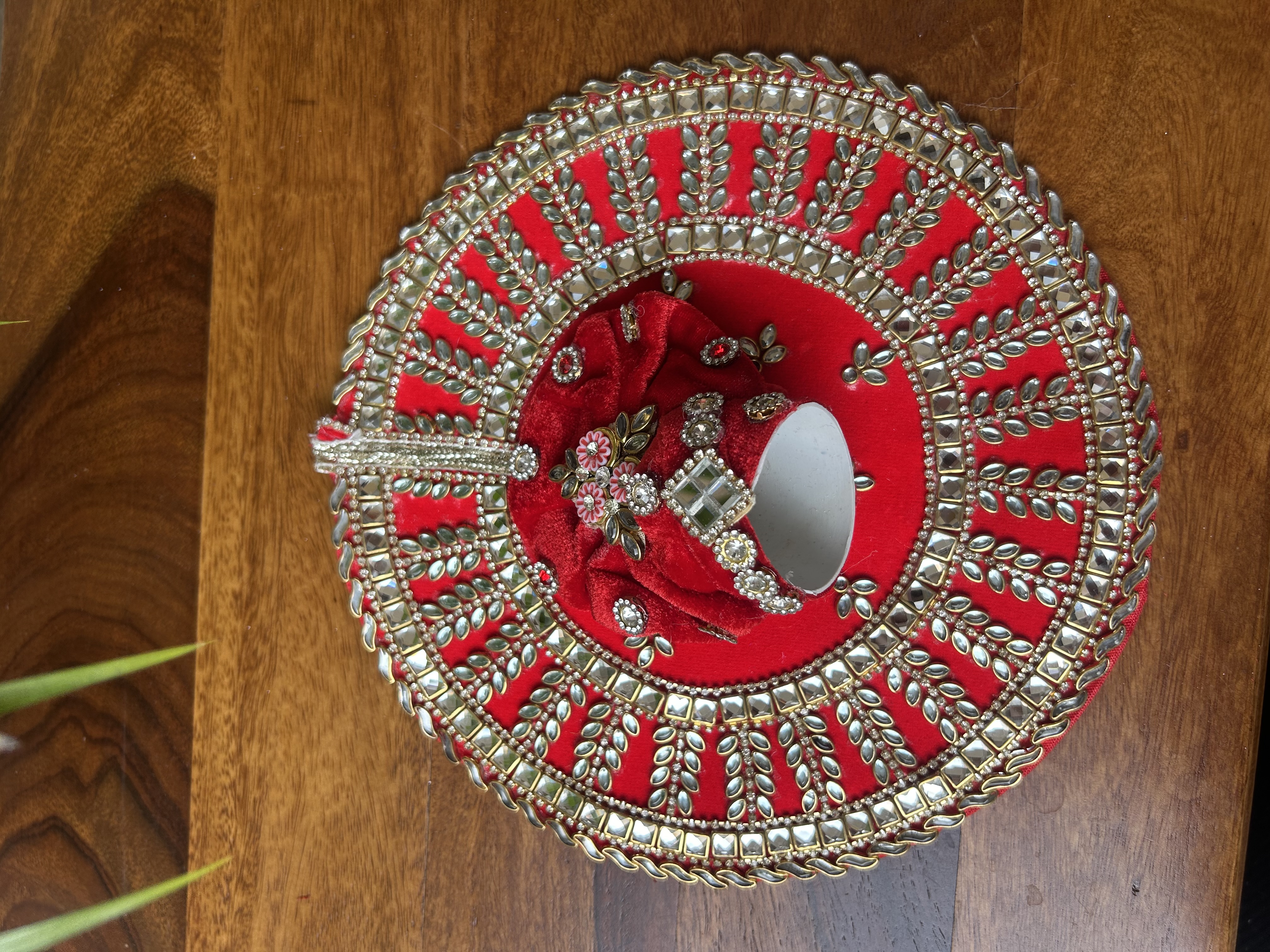 Laddu Gopal dresses are intricately crafted with detailed designs and embellishments, highlighting the craftsmanship and precision involved in creating these outfits. These dresses are made with high-quality fabrics like silk, velvet, and cotton for a luxurious feel. Adorned with zari work, sequins, beads, and embroidery offering a majestic and elegant appearance to the deity, making them ideal for grand occasions and festive events. Discover our beautifully handcrafted Laddu Gopal Poshak, designed to adorn your beloved deity with elegance and devotion.