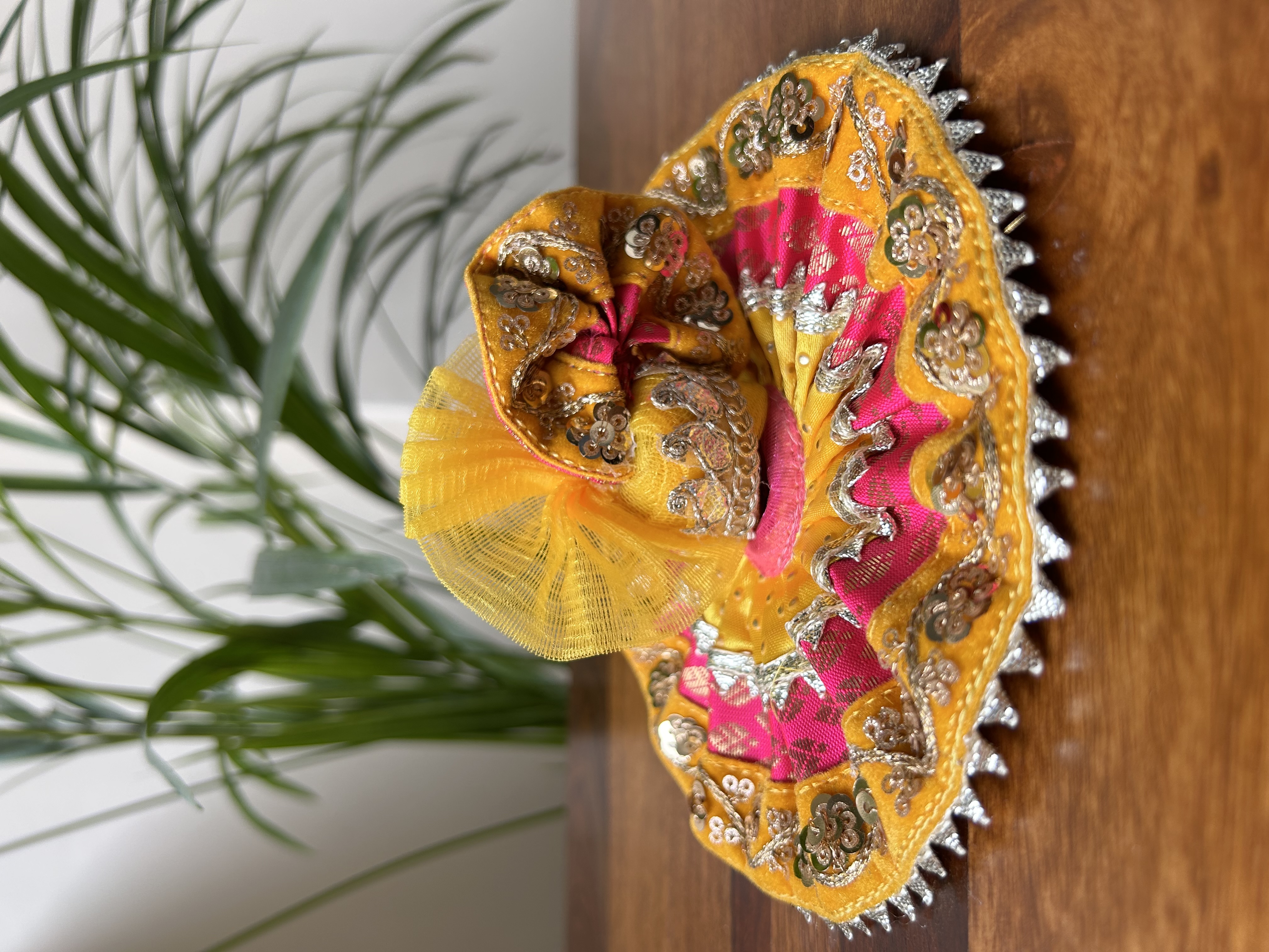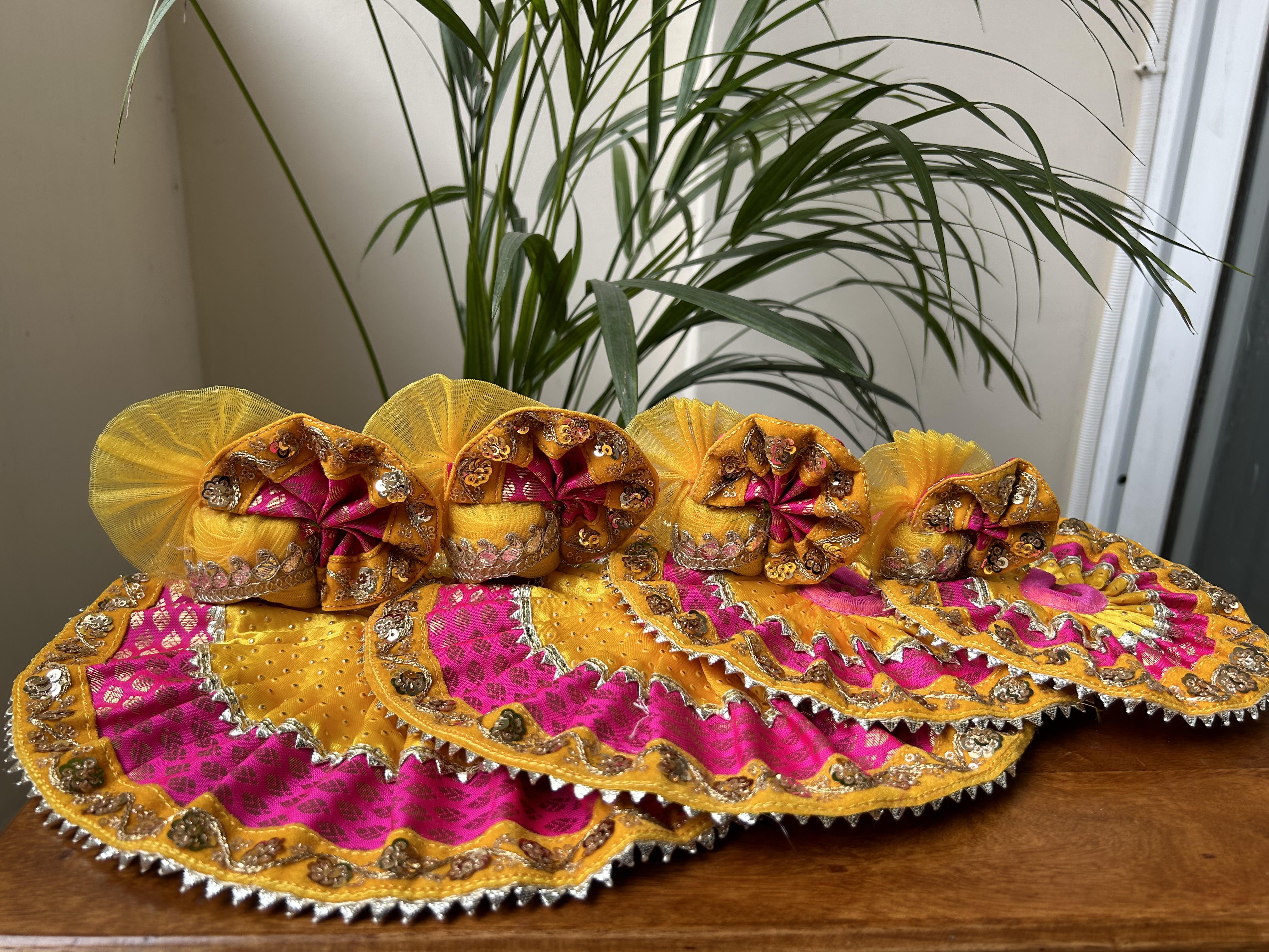 Laddu Gopal dresses are intricately crafted with detailed designs and embellishments, highlighting the craftsmanship and precision involved in creating these outfits. These dresses are made with high-quality fabrics like silk, velvet, and cotton for a luxurious feel. Adorned with zari work, sequins, beads, and embroidery offering a majestic and elegant appearance to the deity, making them ideal for grand occasions and festive events. Discover our beautifully handcrafted Laddu Gopal Poshak, designed to adorn your beloved deity with elegance and devotion.